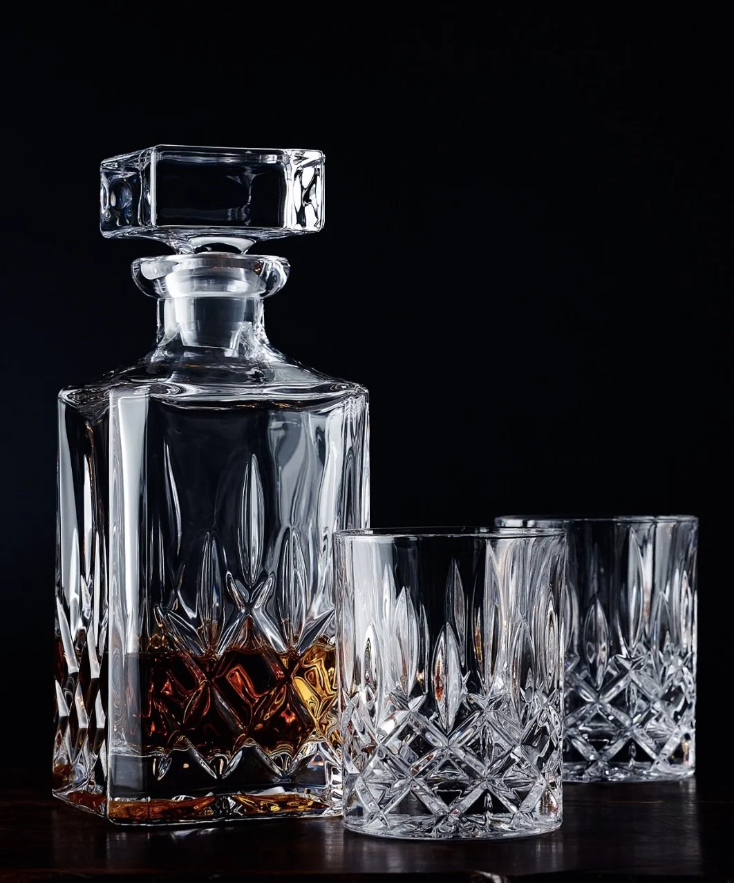 Nachtmann crystal style cut heavy base Decanter set with matching whiskey glasses. Made in Germany.